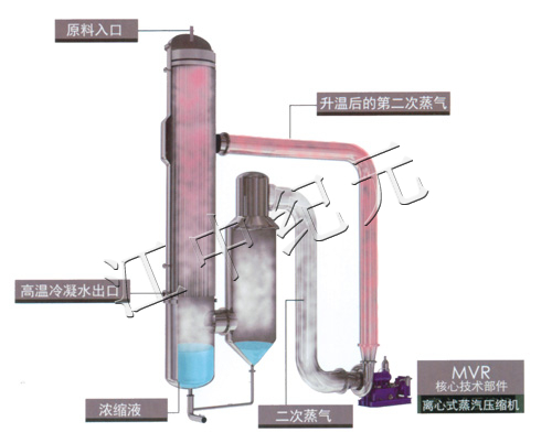 ◆ 节能:由于100%循环利用二次蒸汽的潜热,完全避免使用 新鲜蒸汽,从而大大减少了能源消耗,运行成本低;